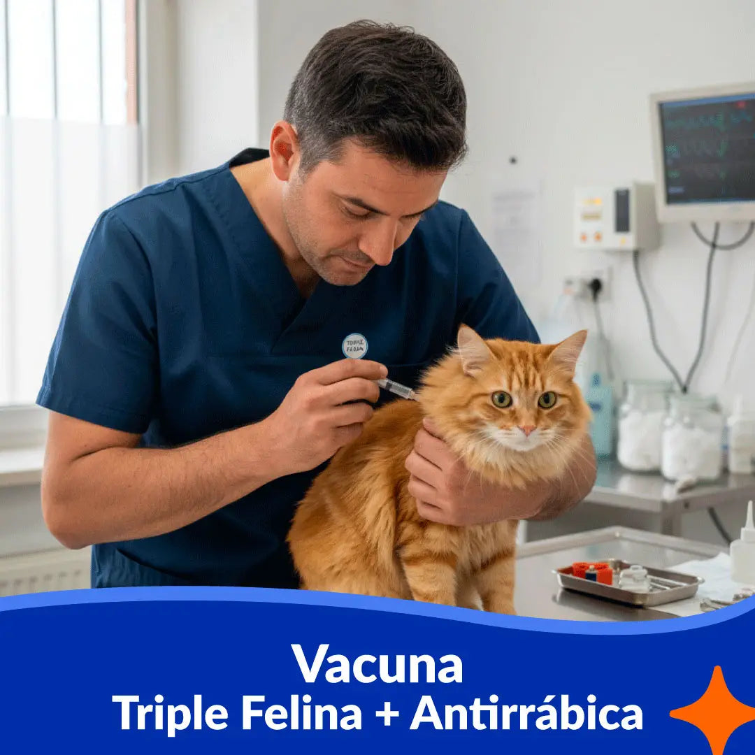 Brinda a tu gato la protección que necesita con nuestro servicio exclusivo de consulta veterinaria + aplicación de la vacuna triple felina (FVRCP) + vacuna antirrabica. Este servicio está diseñado especialmente para gatos, con un enfoque respetuoso, tranquilo y libre de estrés, ideal para reforzar su sistema inmunológico frente a enfermedades comunes y potencialmente graves.